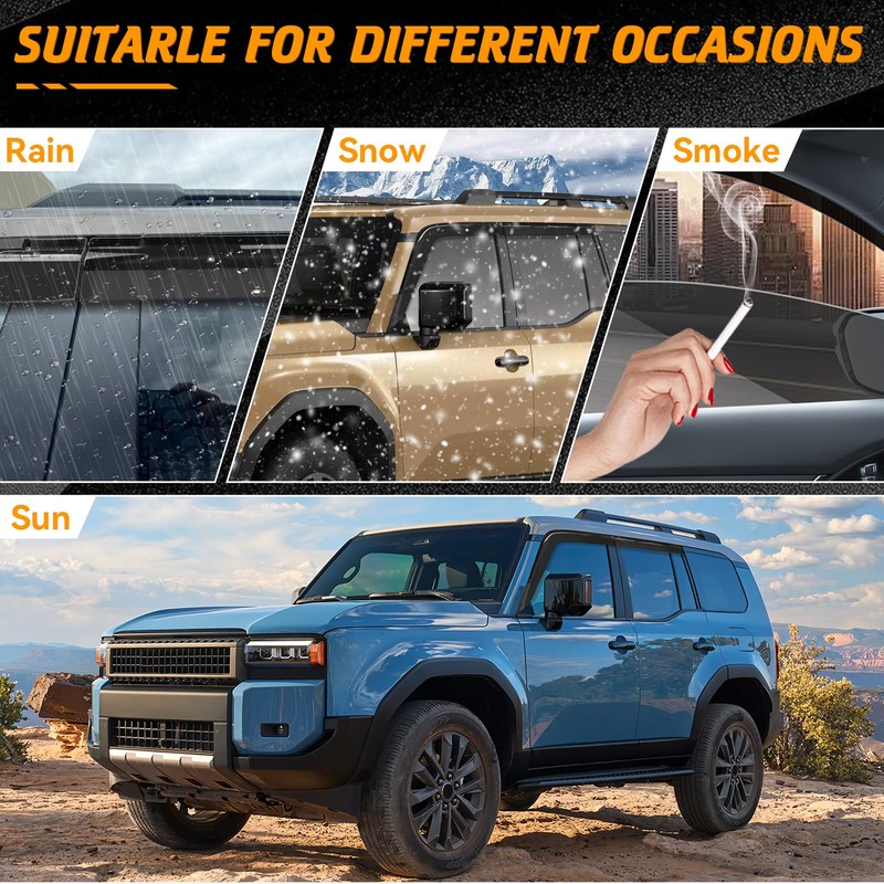 - Tape-On Window Deflectors: The rain guards fit for 2024 2025 Toyota Land Cruiser Prado LC250 J250, these side window visors rain guards 4pcs are providing stylish, modern look while providing optimal functionality