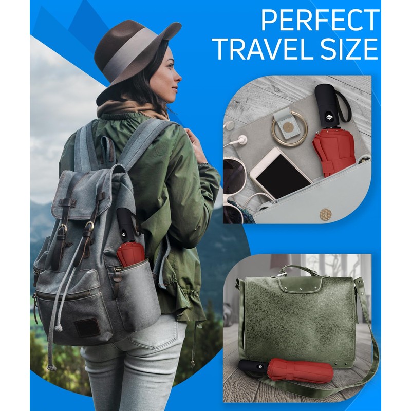 - Compact and Lightweight: Our portable umbrella is the ideal travel companion, functioning as a small umbrella for purse, backpack umbrella, and foldable pocket umbrella. It collapses to 12 inches in length, weighing less than 1 pound; be protected no matter where you go