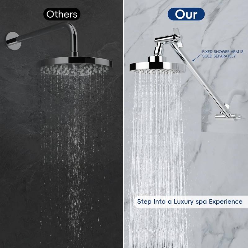 - 【11in Adjustable Shower Extension Arm】With an overall length of 11 inches for the curved shower head extension arm, 8.4 inches for the center arm, and 6 inches in diameter for the shower head, the adjustable height and angle of the shower head not only adds a touch of elegance to the bathroom, but also enhances the weight-bearing capacity of the bathroom. This innovative design ensures that the shower head stays vertical and at the optimal height without hitting the shower arm. You can easily adjust the arm to achieve the perfect shower position for a comfortable and enjoyable bathing experience!