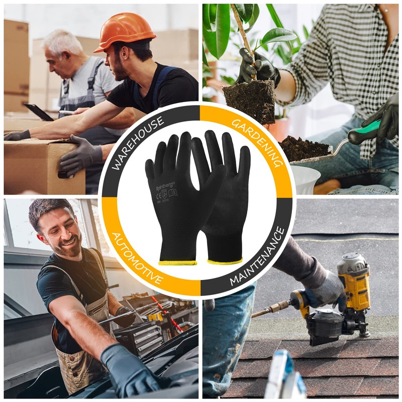 Rainberg Pack of 12 or 24 Safety Gloves, Work Gloves, with Secure Grip on Palm & Fingers, PU and Nylon Non-Slip Gloves, Ideal for General Duty Work, Gardening. (Pack of 24 Pair's, Small)