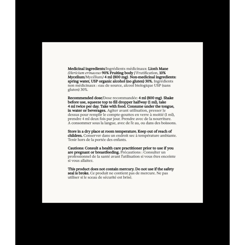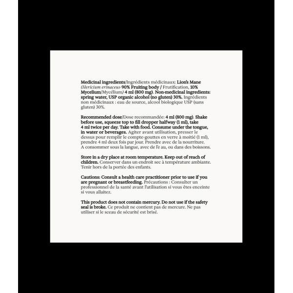 Medicinal ingredients (per 4mL) : Lion s Mane (Hericium erinaceus - 90% Fruiting body, 10% Mycelium), 800 mg. Non-medicinal ingredients: spring water, organic vegetable glycerin (flax-derived) 50%.