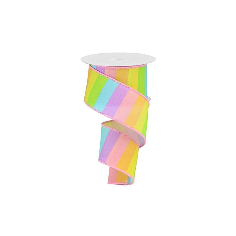 A ten yard roll of 2.5" canvas ribbon with wide pastel rainbow stripes. Includes wired edge. 10 yards or 30 feet per roll. 100% Polyester.