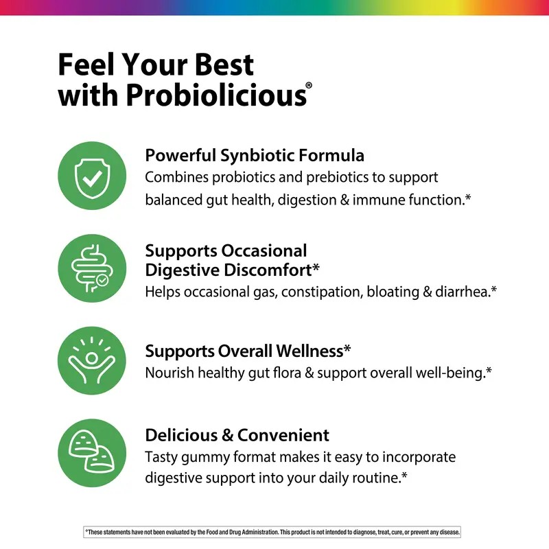 Rainbow Light Probiolicious Probiotic Gummies deliver effective digestive and immune support in a delicious, natural fruit-flavored gummy. Each serving contains 1 billion CFU of Bacillus coagulans, a resilient probiotic strain that helps balance gut flora and promote healthy digestion. These vegan-friendly gummies are made without gluten, dairy, or artificial sweeteners, making them a clean and convenient choice for daily wellness. Designed for both adults and teens, Probiolicious supports nutrient absorption, regularity, and overall gut health. With a great taste and no need for refrigeration, they’re perfect for on-the-go probiotic support.