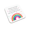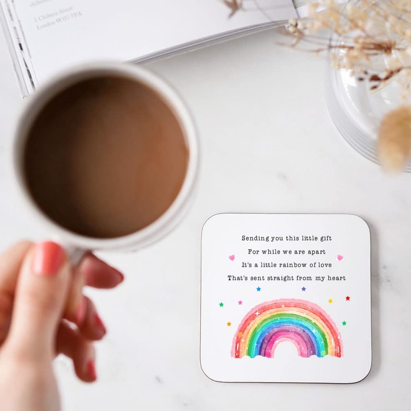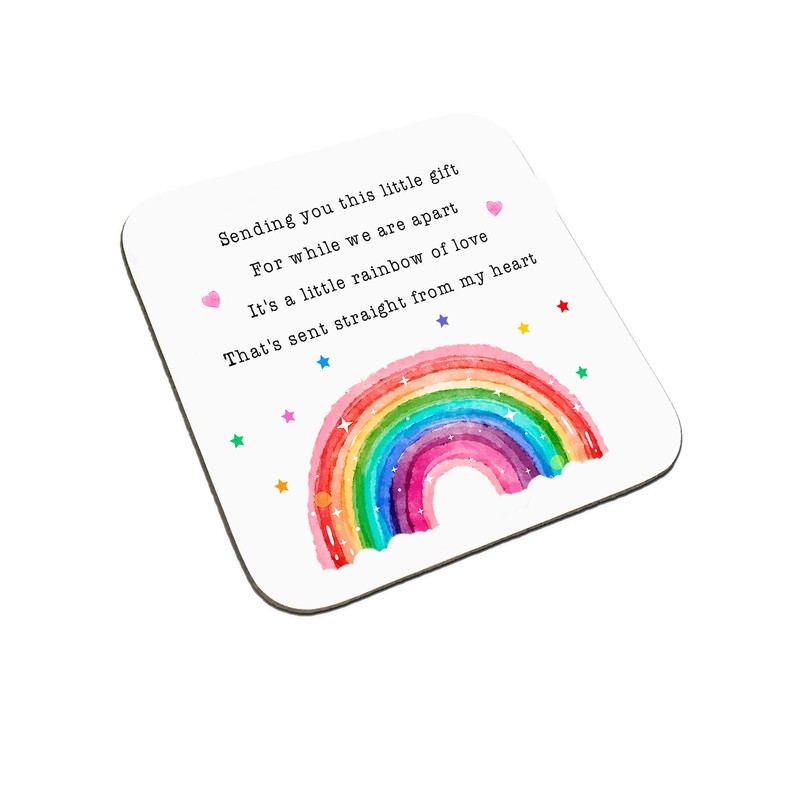 This gift coaster is made from hardwood with a smooth glossy finish, it is professionally printed with a simple yet unique design which reads; Sending you this little gift, For while we are apart, It's a little rainbow of love, That's sent straight from my/our heart(s) The coaster measures 9cm x 9cm x 4mm thick and makes a great token yet sentimental gift. Perfect for sending through the post as a little pick me up.