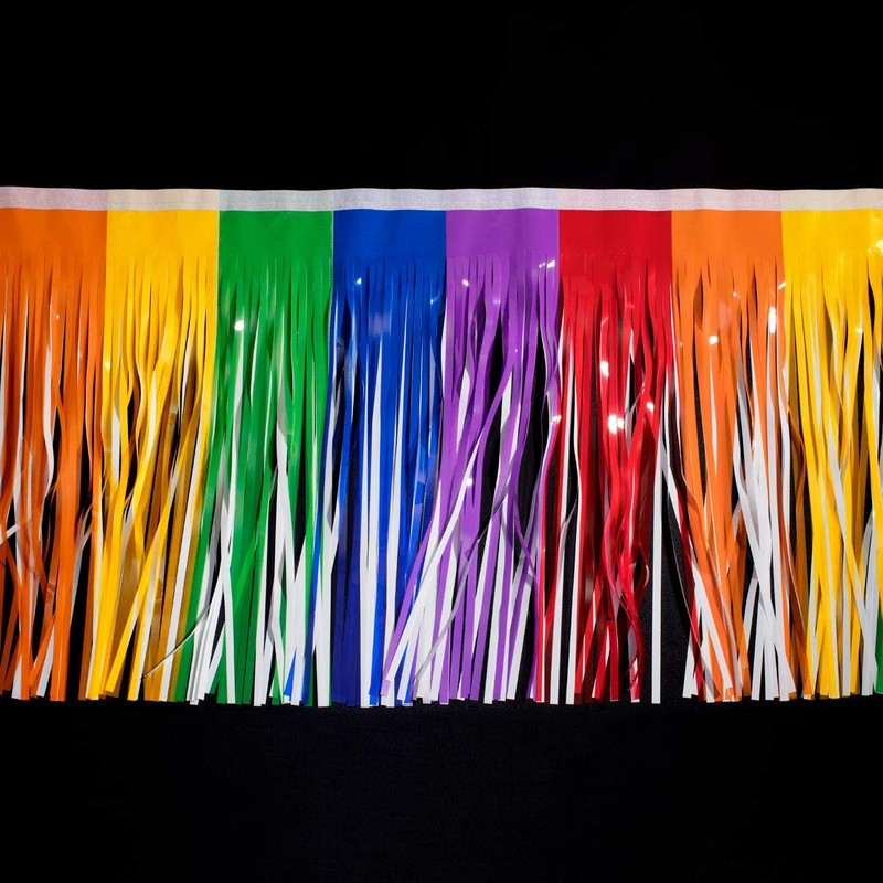 Your parade float and Prom or Homecoming theme decorations are sure to get noticed with this vibrant Rainbow Fringe decoration. Made of sturdy vinyl, the 15 inches high x 10 feet long fringed garland easily covers the underside of your float trailer for a fun and colorful look. You can also create fun table skirts, wall coverings, or hanging ceiling decorations to match a colorful Candy Land, Tropical, or Mardi Gras event theme. With so many ways to use it, this Rainbow Fringe is a must-have for all your event decorating.