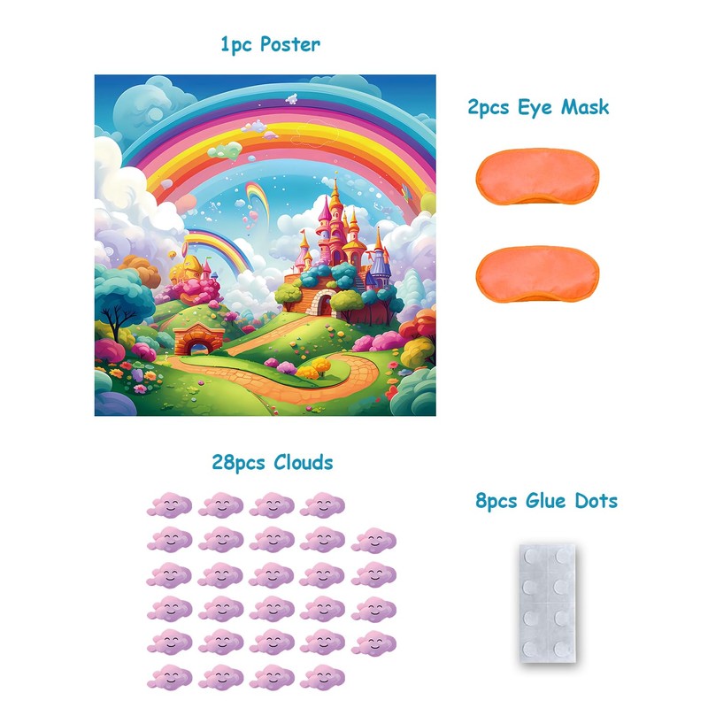 - Package included: 1pc rainbow poster, 28pcs cloud stickers, 2pcs blindfold, 8pcs glue dots.
