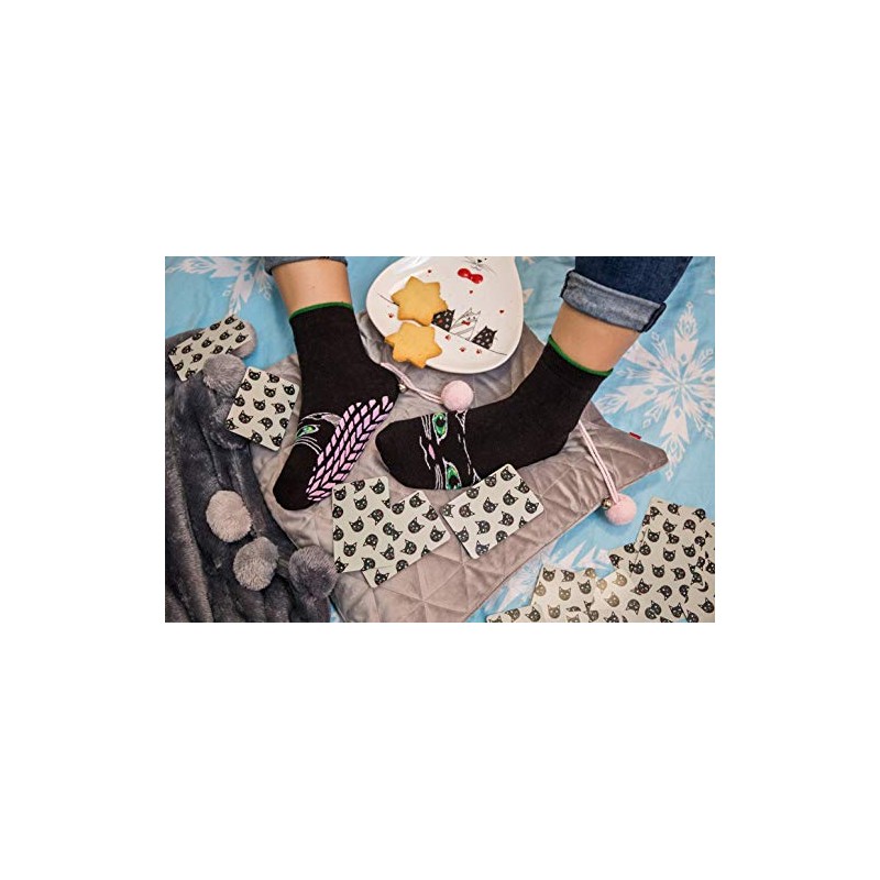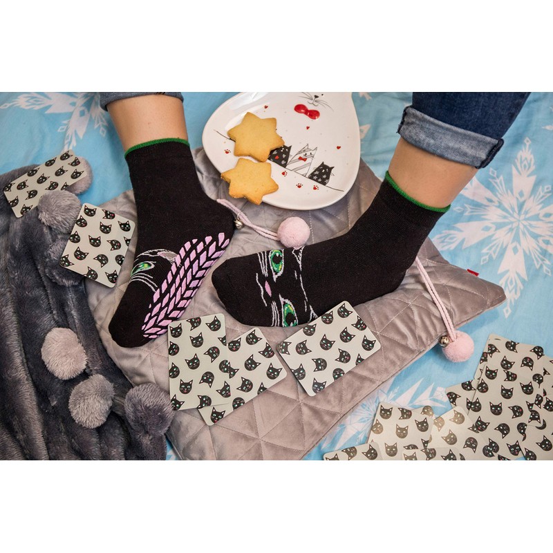 - Cat Socks Box are socks that look like a cat. Each sock has big eyes, a pink nose, long whiskers, a smiling mouth, and a tail, i.e. a pompom with a bell, attached with a strap. Cat socks are available in boxes of three, in three colours: black with a pink pompom, white with a blue pompom and grey with a light blue pompom, always with a non-slip layer. You can choose a pair. Available sizes: UK 3, 4, 5, 6, 7 (EU 36, 37, 38, 39, 40).