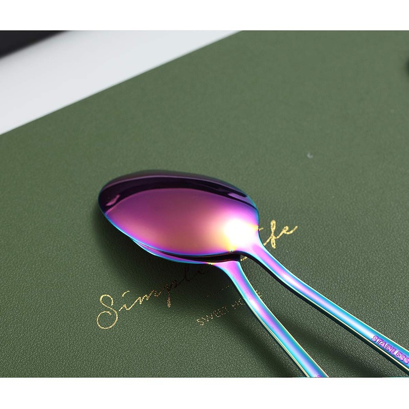 - Classic Design with smooth edge polish. Mirror finish on the surface looks shiny and beautiful.The rainbow plating on the spoons make it much luxury and royalty.