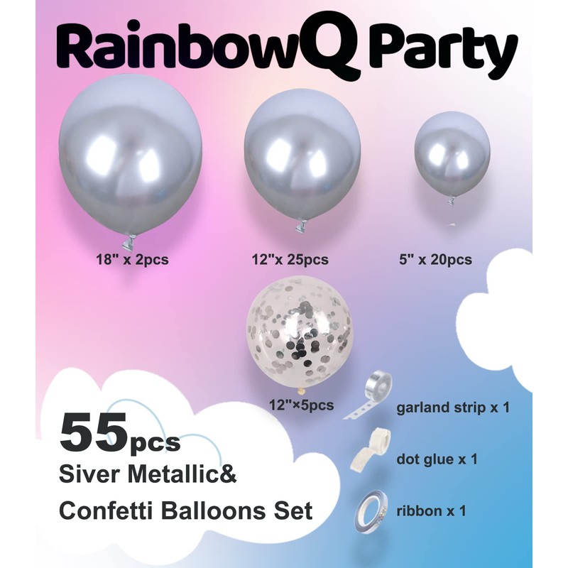 - [ Package Included ] - 20pcs 5 inch silver metallic balloons, 25pcs 12 inch silver metallic balloons, 2pcs 18 inch silver metallic balloons, 5pcs silver confetti balloons, 1 garland strip, 1 ribbon, and 1 dot glue