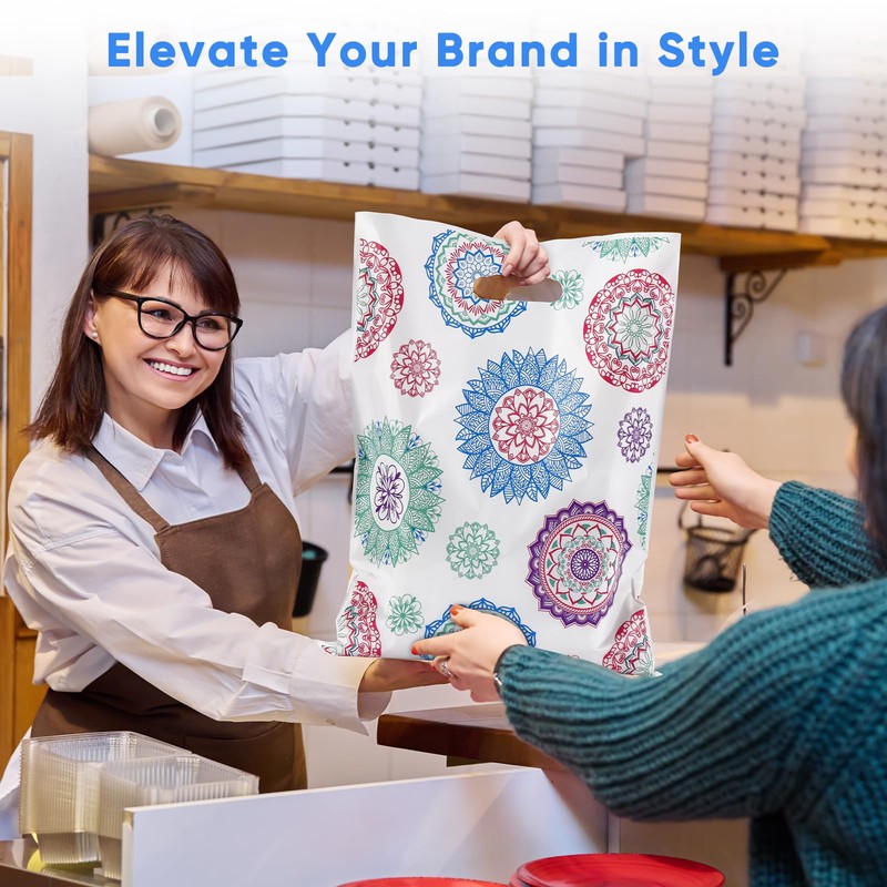 - ELEVATE YOUR BRAND: Show off your unique style with 12" W x 15" H non-gusseted, trendy plastic shopping bags perfect for retail products, crafts, party favors & thank you gifts for birthdays, showers & events; colorful Mandala design on white plastic bags