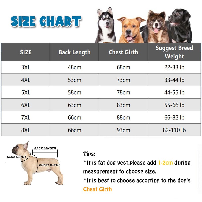 - Size: For a correct fit, it is necessary to measure your dog's body length, chest and neck and compare with the size chart provided. Due to manual measurement, it is recommended to add 2-3cm of space during measurement.
