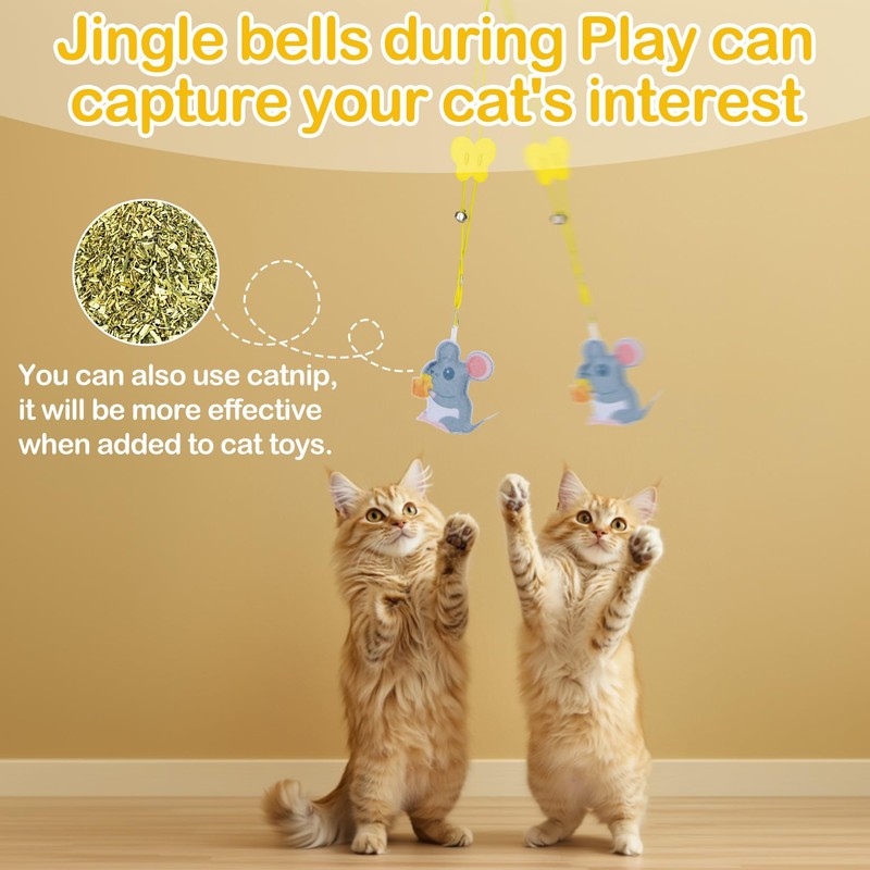Cat’s Favorite:Cats are hardwired for the thrill of the chase! Our swinging toys "lure" mimics prey movements, igniting your cat’s innate hunting instincts and turning playtime into an exhilarating adventure. Watch them leap, sprint, and pounce like wild predators, driven by the irresistible motion of the toy.Catnip can get lounging cats up and moving and effectively helps relieve cat’s anxiety. You can also use catnip, it will be more effective when added to cat toys.