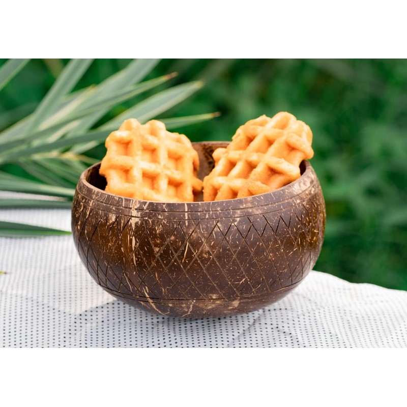 With a contemporary pattern of crisscross carvings over a polished coconut surface, the Crisscross Coconut Bowl seems to marry traditional art with modern style. On either side of its lattice-like engraving are parallel lines, completing the bowl’s intricate design. Whether you’re munching on afternoon snacks or blending some healthy breakfast smoothie, this coconut bowl can serve as the perfect canvas for your creations!