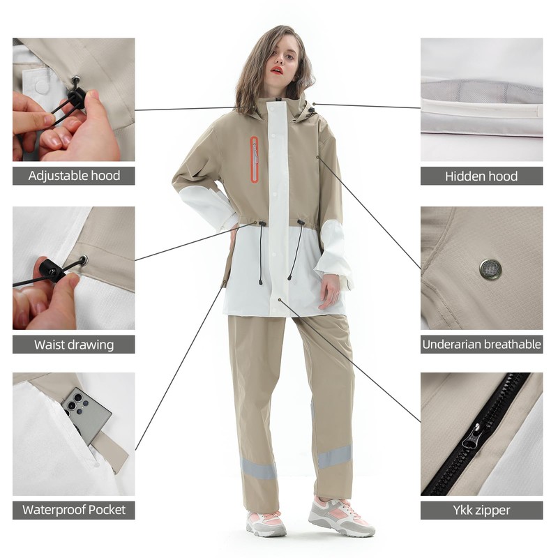 - Waterproof & Breathable: The Rain suits are made of high density polyester fiber and seal seams, which can effectively prevent rainwater from penetrating. The internal soft mesh lining can provide good air circulation, enhance the breathability, and make the skin feel more comfortable.