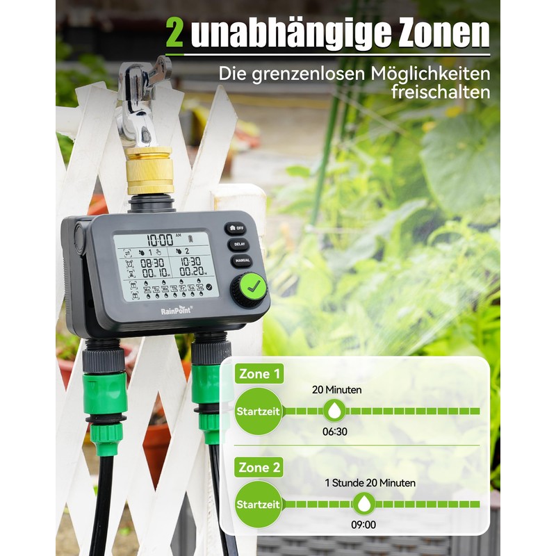 • 2 independent programmable zones: RAINPOINT sprinkler timer with 2 large outputs (flow rate 5-35 L/min) allows you to adjust the watering schedule (start time, frequency and runtime) for each zone, so you have complete control over the watering of every area of your garden and lawn and water your lawn evenly, efficiently and easily!