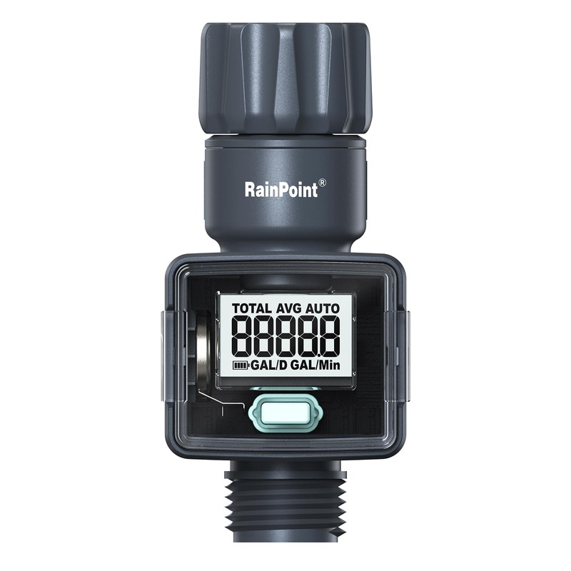 RAINPOINT water meter uses a double leak-proof design, equipped with a waterproof rubber ring to achieve all-round waterproof and strong durability. Besides, the water flow meter supports 4 measurement modes (real-time flow/last water consumption/7-day average/total water volume). The units can be switched (liters/gallons), and the maximum measurement value is 9999.9 liters/gallon. Built-in high-precision Hall sensor and high-efficiency wind wheel structure, the error is less than 5%. The water meter for garden hose can accurately monitor the water volume of RV water tank, save water and reduce fees, and the built-in filter prevents impurities from affecting the data. The high-definition LCD screen supports one-button operation, automatically sleeps after 1 minute of no operation, and wakes up when the water flow is restored. In addition, the flow meter uses UV-resistant ABS material and IPX6 waterproof, which is suitable for garden watering, pool water replenishment, RV travel and other scenes. Pay attention to the water flow direction mark during installation to ensure accurate measurement.