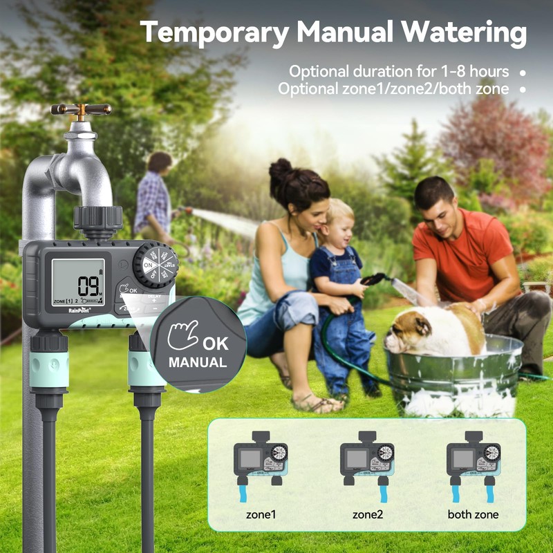 - Manual Watering Modes: The RAINPOINT Sprinkler Timer also includes 3 separate manual modes. Simply switch between zones - ZONE 1, ZONE 2, and BOTH ZONE - to select the desired area for manual watering. Customize the duration of manual watering, ranging from 1 minute to 8 hours. This feature is designed to provide a quick and easy solution for watering whenever and wherever necessary