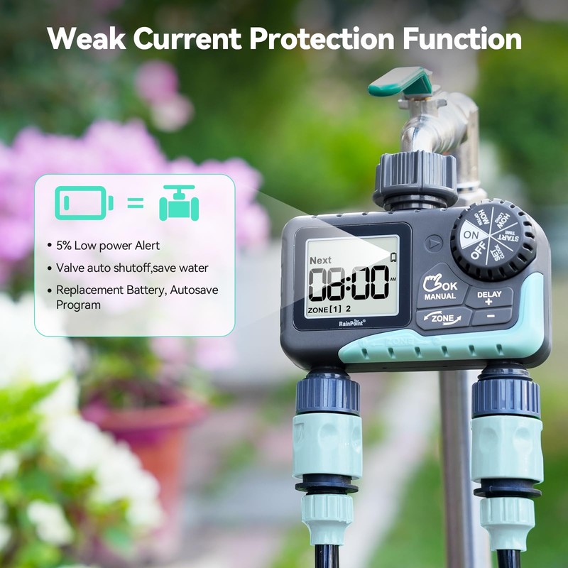 - LCD Screen Display Rainpoint 2-zone water timer features a 2.5" easy-to-read LCD display that provides detailed information, including watering time, next irrigation plans, and power status.