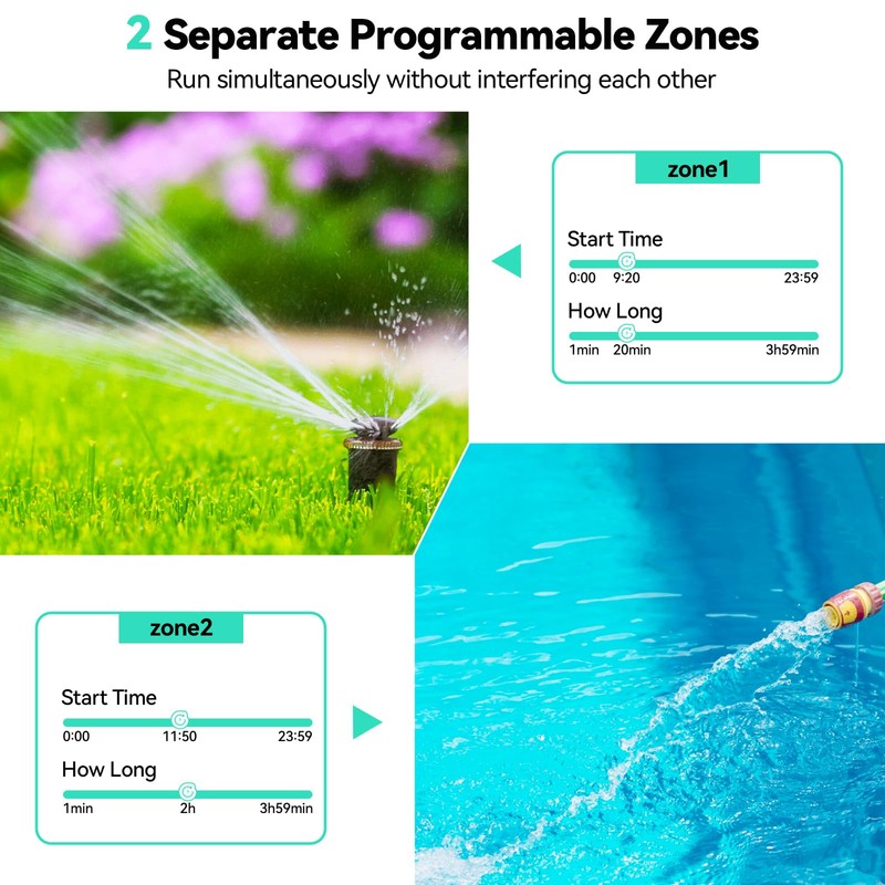 - Customizable Timer: Multi-Scene Hose Timer suitable for garden watering, vegetable watering, pool filling, sprayer cooling also can be lawn sprinkler controller and mist system controller, program each zone with specific start time, frequency, and watering duration time. Ensure even, efficient, and effortless watering of every area of your yard and lawn.