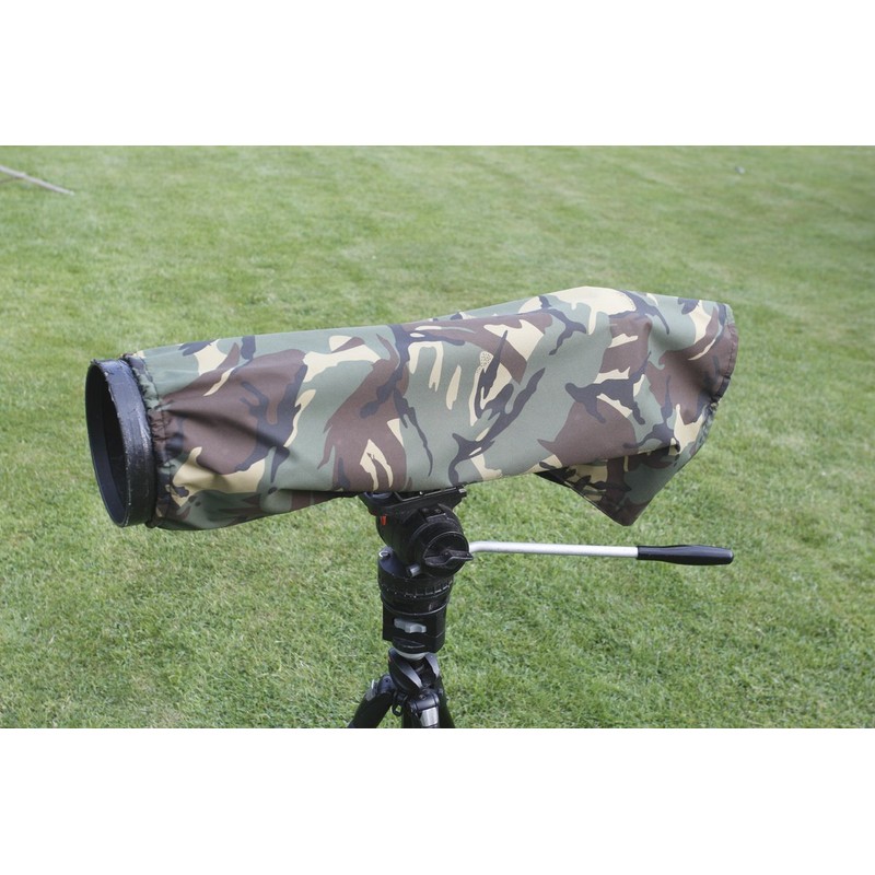 Weatherproof, army camouflage pattern DPM material for telephoto lenses used by wildlife and sports photographers. There is a drawcord at the rear to allow easy access to the camera. The lower edge has a velcro join so the sleeve can be fitted and removed quickly while on a tripod. This size is suitable for lenses up to 16 cm diameter and Approx LENGHT SIZE is 59 CM. For lenses like the Canon, Nikon or Sigma 300mm f2.8.