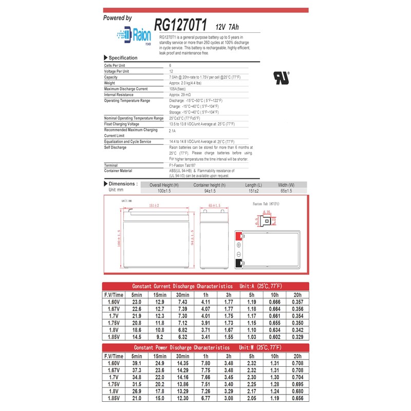 - This battery is UL Listed, CE Rated, and manufactured in ISO 9001 facilities.