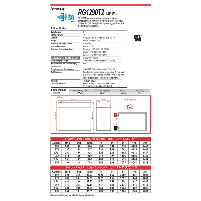 - This battery is UL Listed, CE Rated, and manufactured in ISO 9001 facilities.