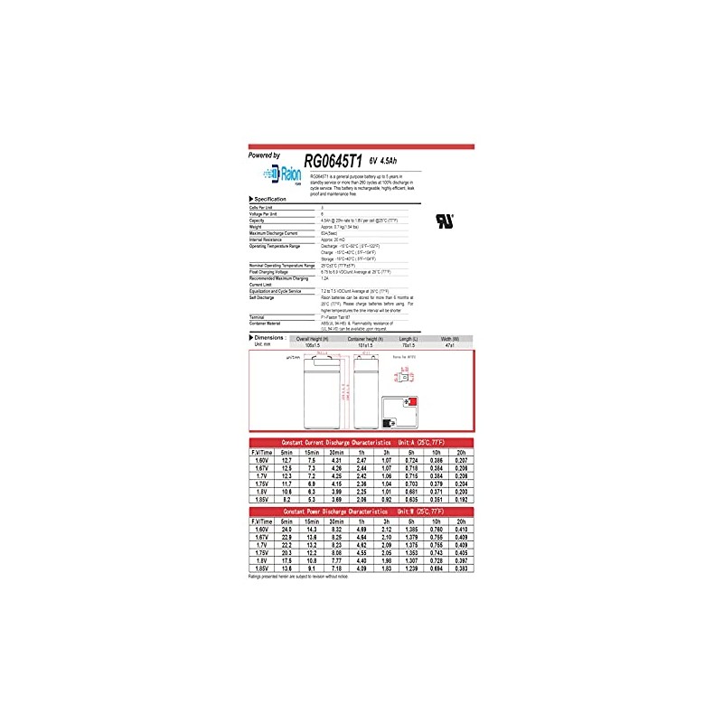 - Raion Power 6V 4.5Ah battery with T1 terminals is a direct replacement for Lithonia ELB 06042 emergency light battery.