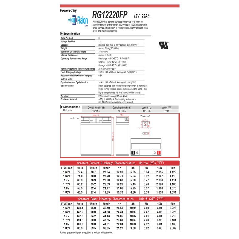 - Raion Power 12V 22Ah replacement batteries for Pride Go-Go Elite Traveller 3 Wheel are UL & CE certified (certification printed on batteries)