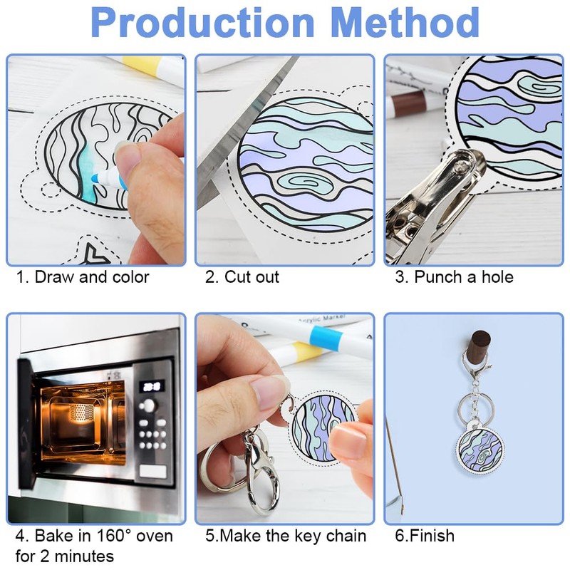 - Easy to use: shrink film kits contain detailed instructions (English language not guaranteed), lay the pattern you need to paint on the matte surface, cut the aluminium foil to make a hole in the top, place it in the 160° oven for two minutes or use a heat gun, do not recommend using a microwave oven and a hot air blower, the contraction of the colour will become more intense