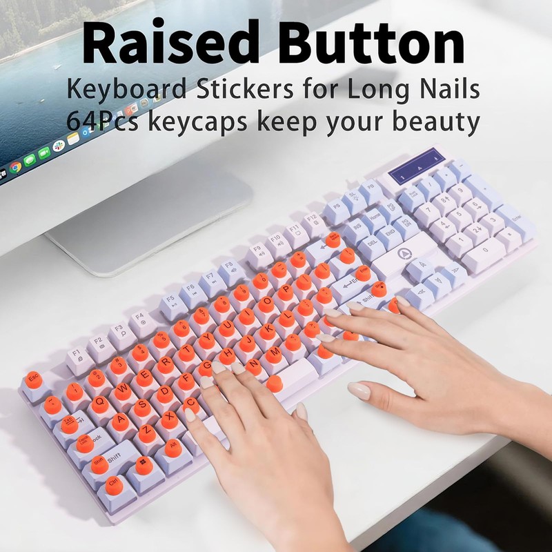 • [ Raised Keyboard Bubbles for Long Nails ]: The raised keyboard bubbles adopt an innovative cylindrical trapezoidal structure, designed to perfectly accommodate the typing postures of users with long nails. And effectively prevents nails from scratching or breaking while enhancing typing speed and accuracy.