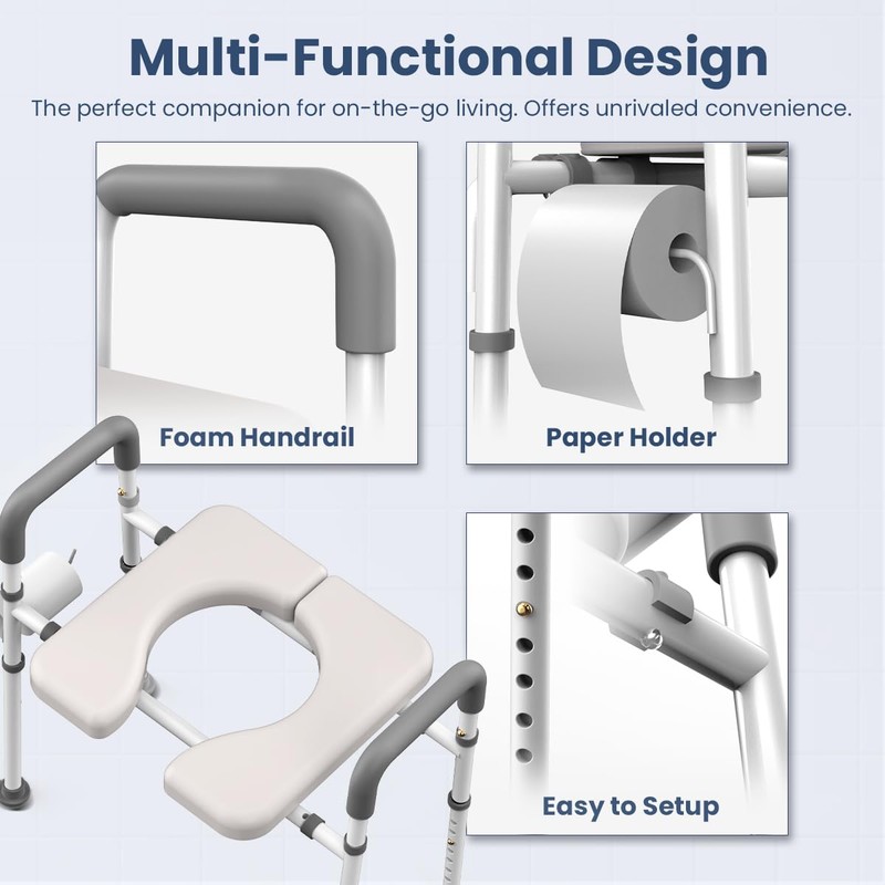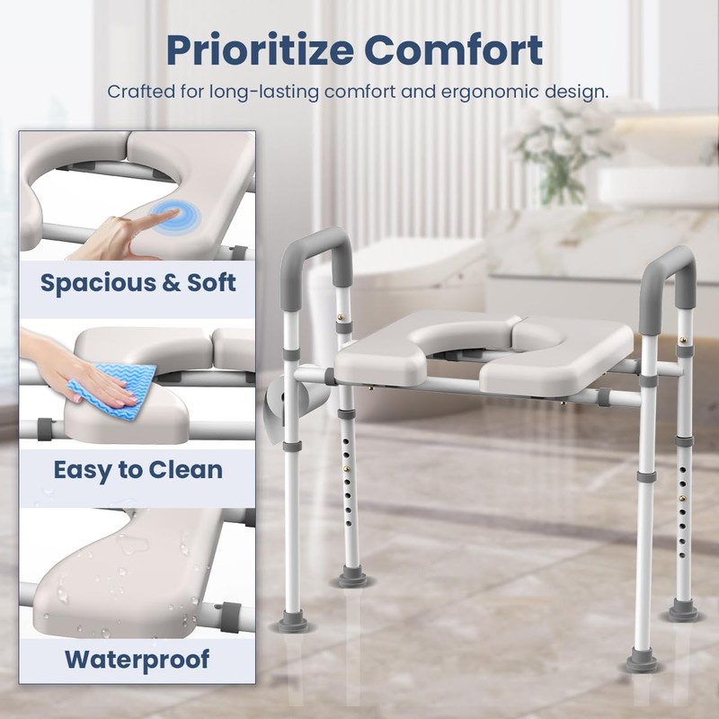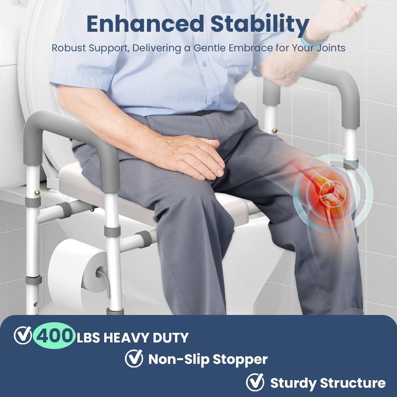 - Designed for All: Our free-standing safety toilet frame is suitable for people of different heights. It is an essential tool for those recovering from surgery, such as a broken hip, femur, Achilles tendon. Simple to clean for assisted living caregivers, it provides a stable support system for sitting or rising from a commode
