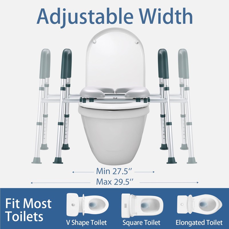 - Adjustable for Fit for All Needs: This raised toilet seat with handles features 6 height and width adjustments for personalized comfort. The seat height adjusts from 16.2" to 21", while the width expands from 27.5" to 29.5", allowing users to customize it for comfort and stability. Ideal for seniors or those needing assistance, it easily adapts to most toilet sizes, ensuring a secure and comfortable fit.