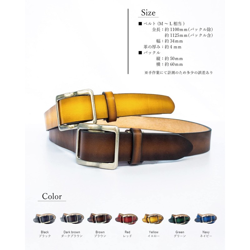 - Material Composition: 100% Leather Color: Black, Dark Brown, Light Brown, Navy, Green, Red, Yellow; Size: Total Length: Approx. 43.3 inches (1100 mm); Compatible Waist: Approx. 35.4 inches (90 cm); Adjustable Belt Width: Approx. 1.3 inches (34 mm); Leather Thickness: Approx. 0.2 inches (4 mm); Buckle Height: Approx. 2.0 inches (50 mm); Width: Approx. 2.4 inches (60 mm); Country of Origin: Japan