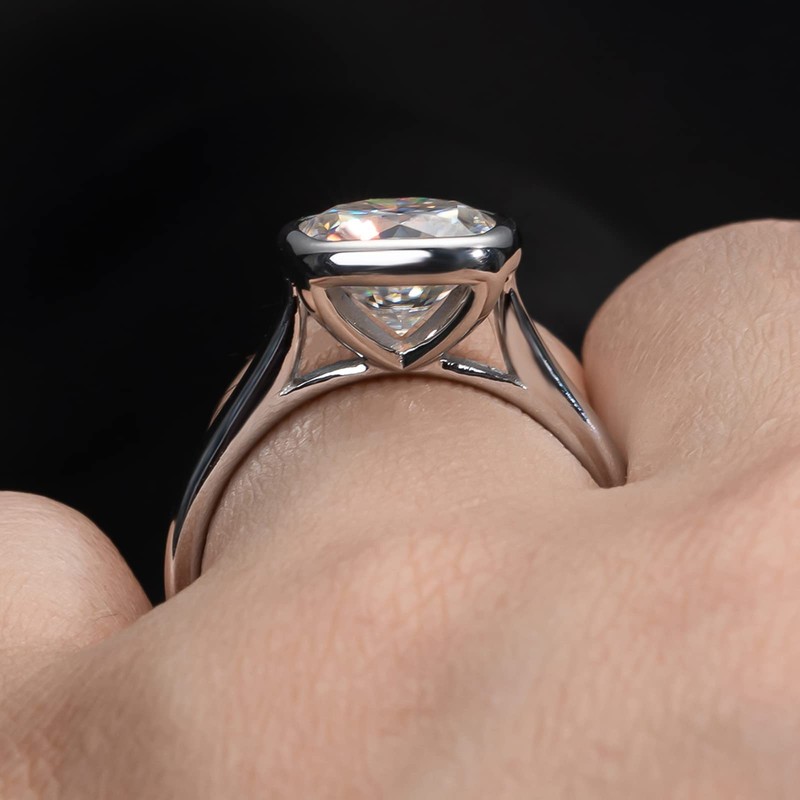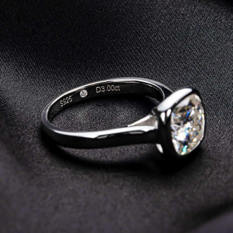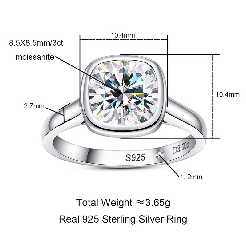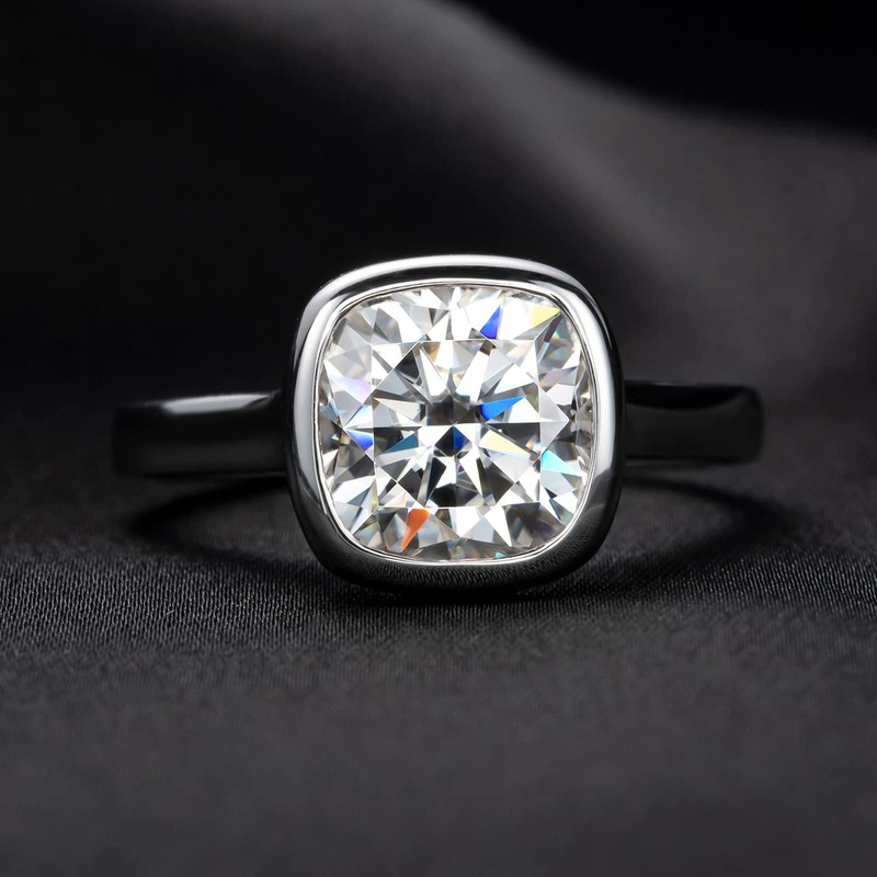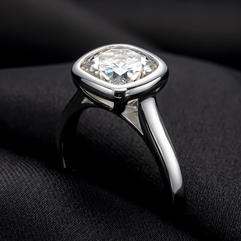 - VIRTUOSIC CUTTING: A 3-carat cushion-cut main stone. With rounded corners, it shows simple and neat lines. Also, it has a soft and full texture, making the light refraction inside the gemstone more diverse and abundant. You should know that the texture of moissanite is extremely hard, thus making its special-shaped cutting process extremely difficult. It is the perfect choice for banquets, feasts, conferences, dates, dances, parties, and travels, making you the focus.