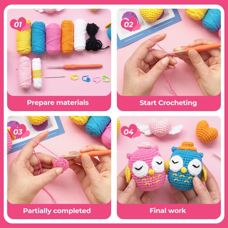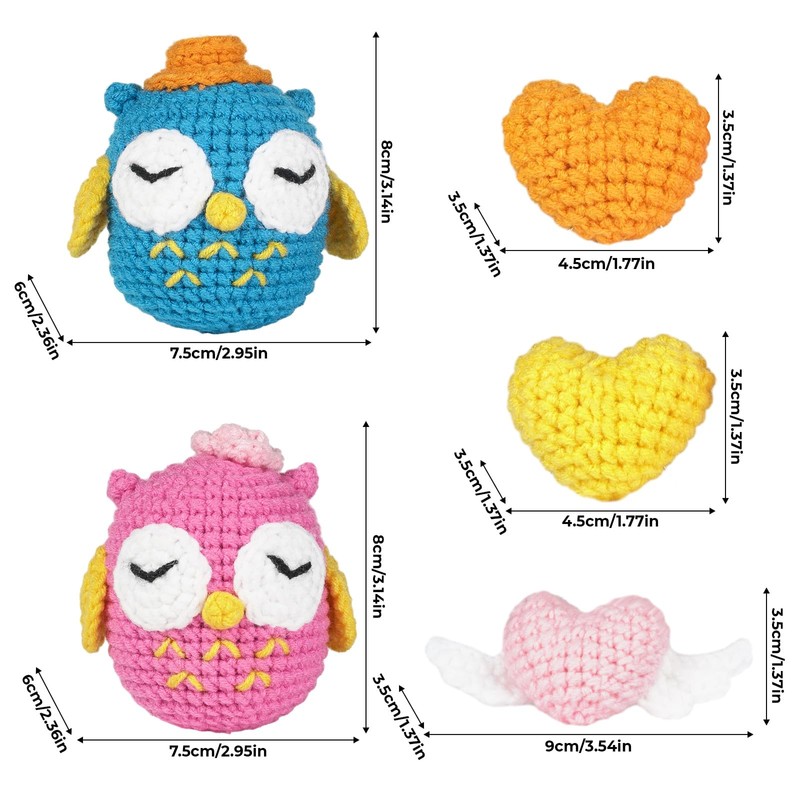 Raixleb Crochet Kits for Beginners Adults/Kids 5PCS Knitting Kit 2 Owls 3 Hearts Crochet Starter Kits with Step-by-Step Video Tutorials for Valentine's Day, Birthdays