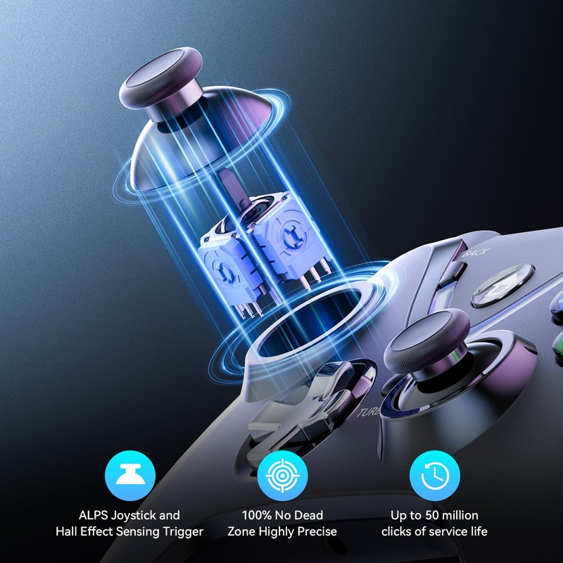 - 🎮Immerse yourself in an unparalleled gaming experience with our cutting-edge wireless controller. Our state-of-the-art ALPS joysticks and Hall Effect Sensing trigger deliver unmatched performance, boasting a lifespan of 50 million clicks with no dead zones or drift. Additionally, our controller features five sets of extra buttons with distinct tactile sensations and varying heights, providing a customizable grip that suits the unique needs of every gamer.