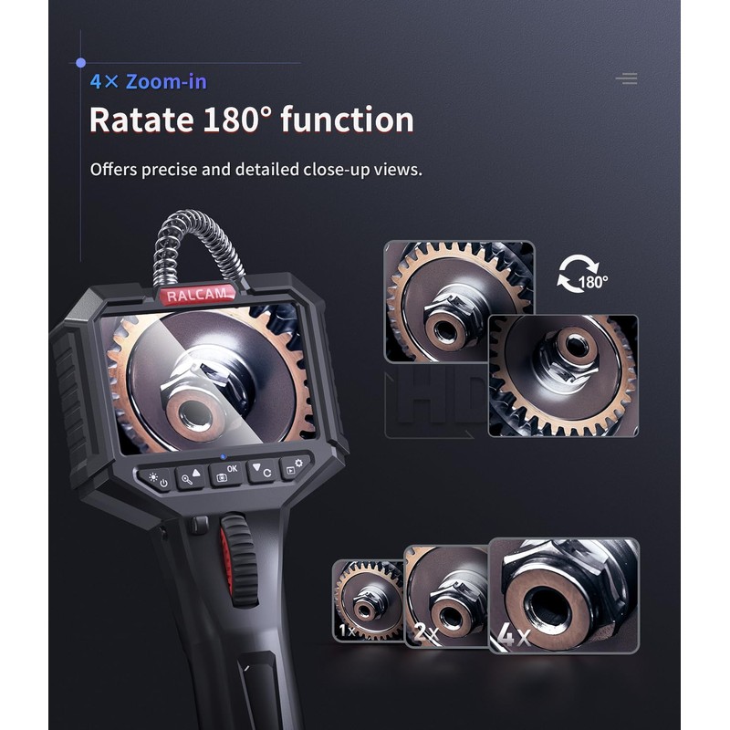 - 179° Full View HD Display with 4x Zoom: Equipped with a 3.5-inch high-resolution display and a 1/9 CMOS chip, ralcam borescope camera offers a clear and lifelike image display. Our HD borescope screen can also rotate 180°, enabling inspections from different angles and enhancing flexibility