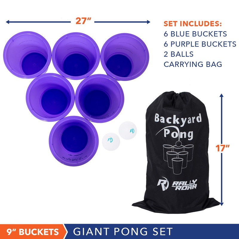 - EVERYTHING BUT THE BOOZE: With the Rally and Roar yard pong set, you receive everything you need to start a riveting party game. This complete set includes: 12 buckets, 2 pong balls, and a drawstring bag for easy portability and tons of fun.