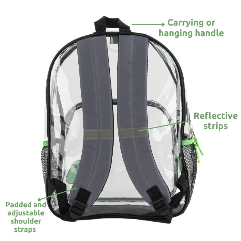 - CLEAR BAG STADIUM APPROVED & SCHOOL COMPLIANT– The back to school bundle includes a large 16 inch clear bookbag (12 x 4 x 16 in.) with two mesh side pockets that have reflective tabs, a large front zip pocket, a matching pencil pouch, and a carabiner clip.