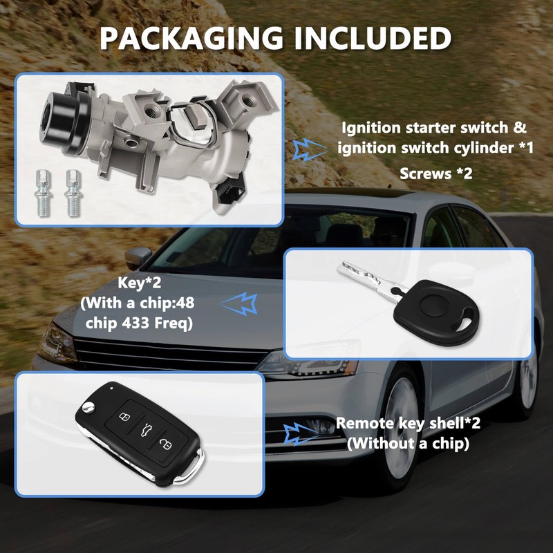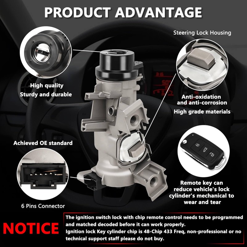 • 【Replacement OE No.】This ignition switch lock cylinder assembly OE part number:1K0905851B,1K0905841 1K0905865, PLEASE MAKE SURE OF THE COMPATIBLE VEHICLES BEFORE ORDERING, THANKS 【Attention】The ignition switch lock with chip remote control needs to be programmed and matched decoded before it can work properly.Ignition lock Key cylinder chip is 48-Chip 433 Freq, non-professional or no technical support staff please do not buy