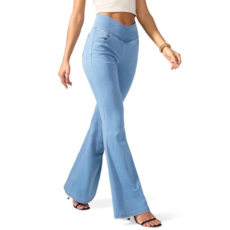 Rammus Flare Jeans for Women Crossover High Waisted Bell Bottom Jeans Trendy Yoga Pants Stretchy Flare Leggings with Pockets Light Denim