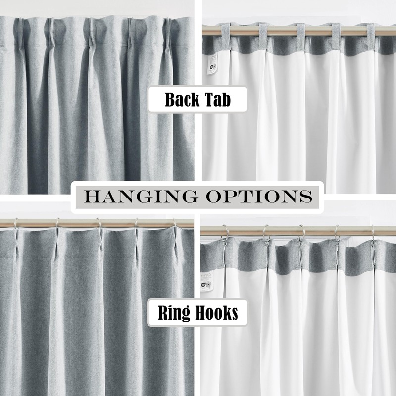 - MULTIPLE HANGING WAYS: Combining the classic pinch pleat for a luxurious, tailored appearance with the convenience of a back tab for easy installation, the blackout curtains have many hanging options: back tabs, ring hooks, clip rings, or track systems. Pleat note that 14 hooks are included but rings and clips are not.
