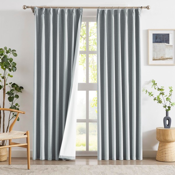 Randall Pinch Pleated 100% Blackout Window Curtains 95 Inch for Bedroom Living Room Chambray Blue Linen Textured Light Blocking Drapes Thermal Insulated Back Tab Window Treatment, 2 Panels, 38"Wx95"L