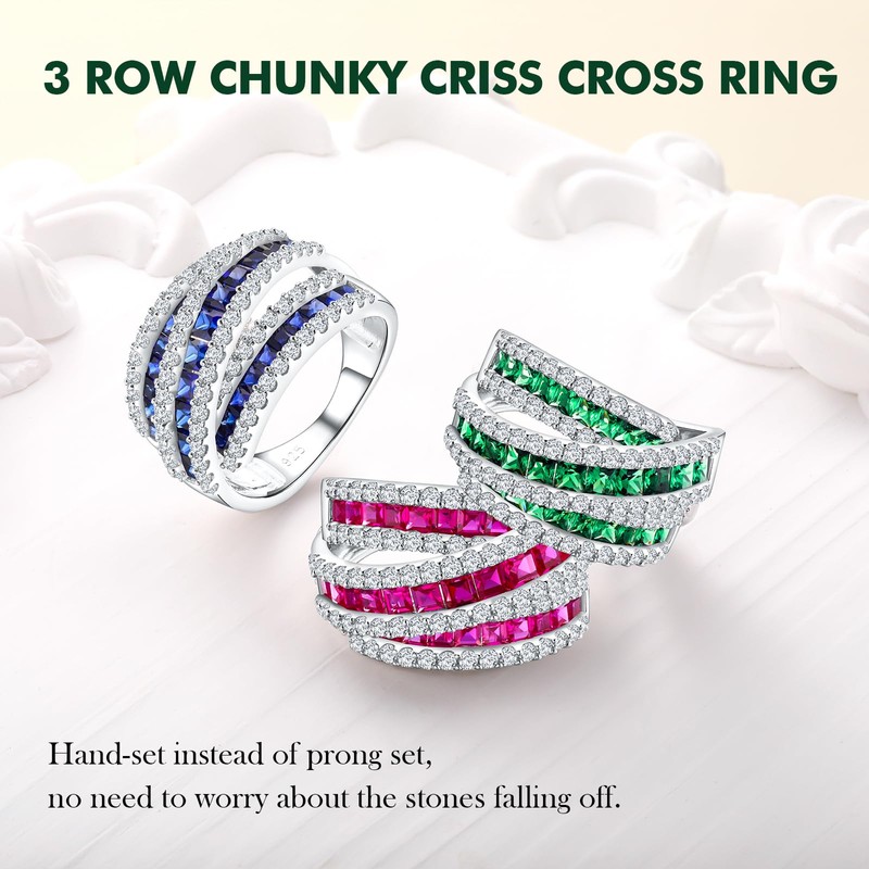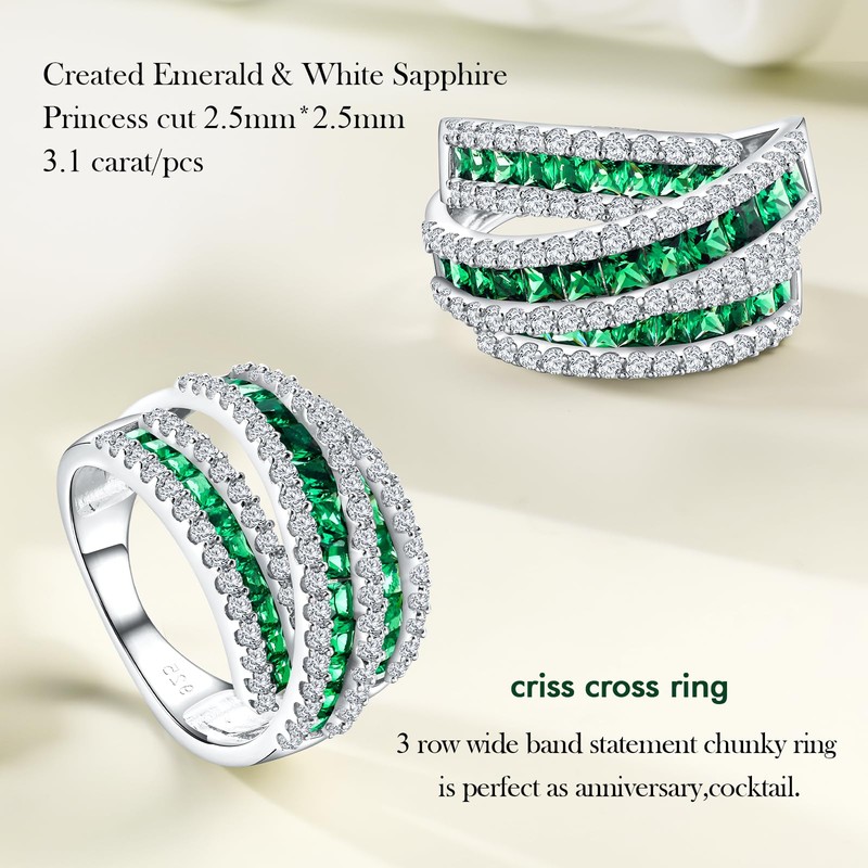 • Criss Cross Emerald Rings for Women: This large band ring is set with 2 carat princess cut created emerald and round cut cubic zirconia, the stones are set tight and will not fall out, and the color is very clear and sparkle