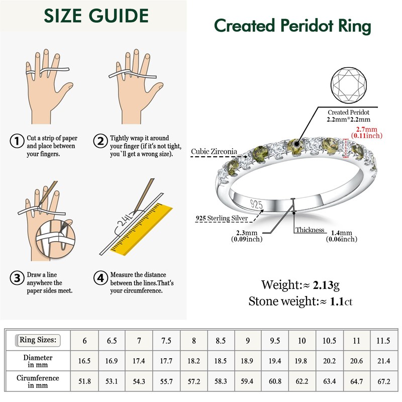 - Sterling Silver Band Rings for Women: This peridot band ring is crafted from hypoallergenic 925 sterling silver and plated with thick rhodium to give extra shine, not easy to fade or turn green, great for sensitive skin and very comfortable to wear