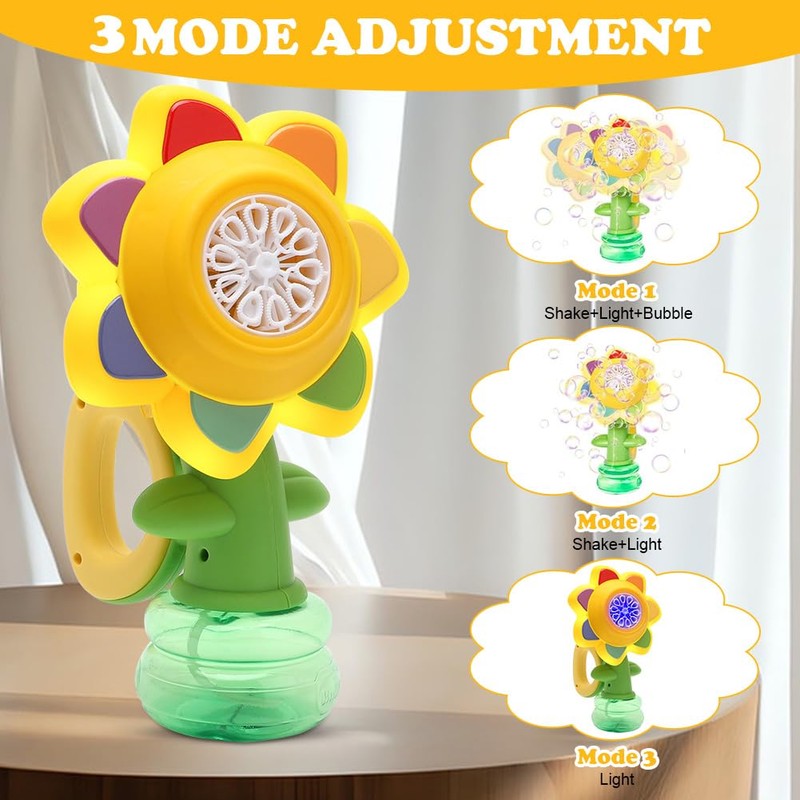 Die Seifenblasenmaschine hat ein wunderschönes Sonnenblumen - Aussehen. Sie ist nicht nur einfach zu bedienen, sondern verfügt auch über mehrere Modi.