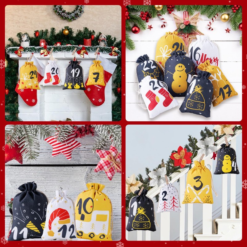 - Original design: 24 advent calendars to fill yourself have 24 designs. Advent calendar bags for filling children are designed based on classic Christmas elements such as snowmen, sleighs, Christmas baubles, Christmas trees, Christmas stockings, etc. The original pattern is more special and in black, white and gold, which makes this bag advent calendar large set more advanced