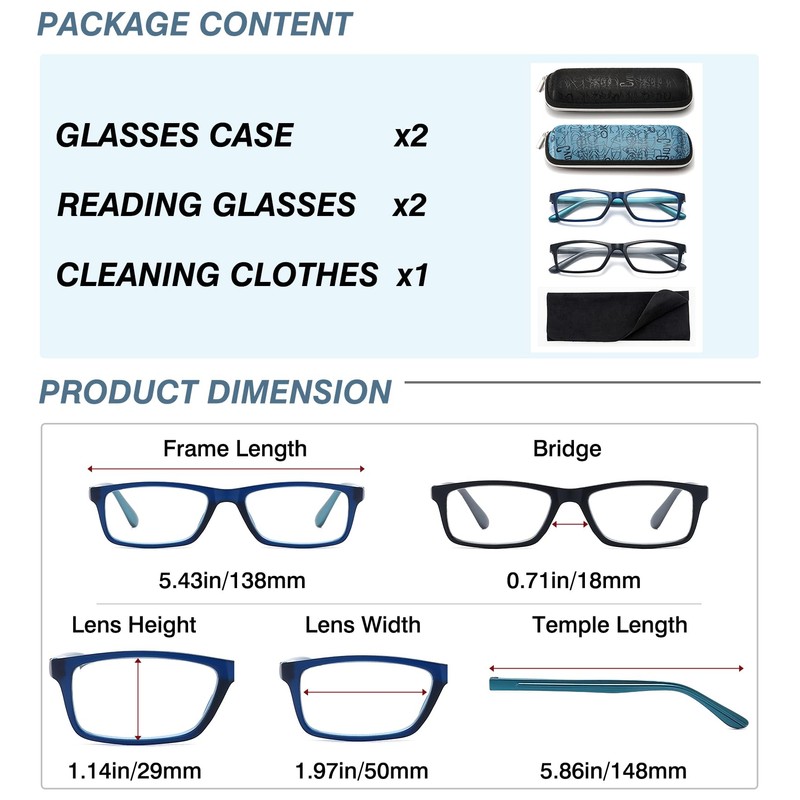 El paquete incluye: 2 lentes de lectura para hombre + 2 hermosas fundas para anteojos + 1 paño de alta calidad.