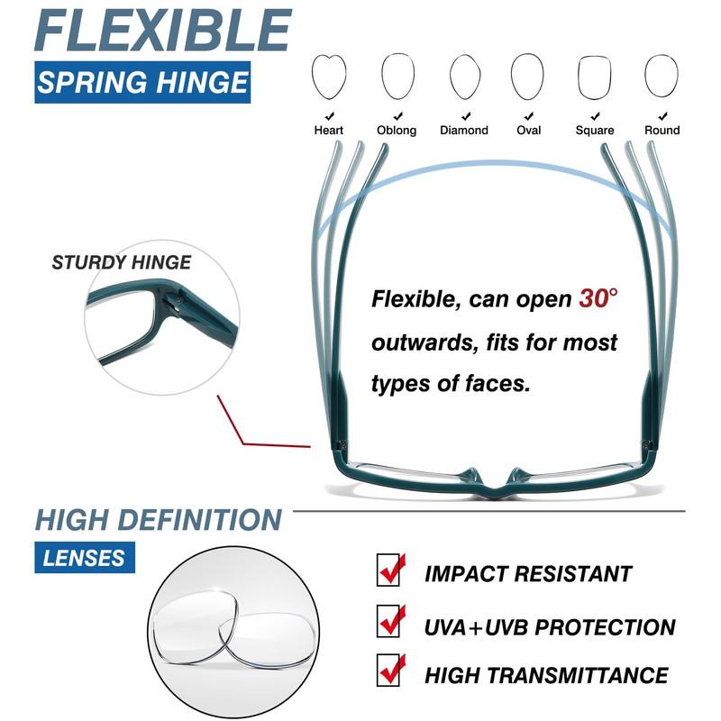 - Bisagras de resorte: estos lentes de lectura vienen con bisagras de resorte. En comparación con las anteojos de lectura tradicionales, el marco de las anteojos con bisagras de resorte se puede abrir hacia fuera 25 grados, reduciendo la presión sobre la cabeza cuando se usa y se ajusta perfectamente a la forma de la cara. El diseño integrado de almohadilla nasal hace que sea difícil que las anteojos de lectura se deslicen de la cara