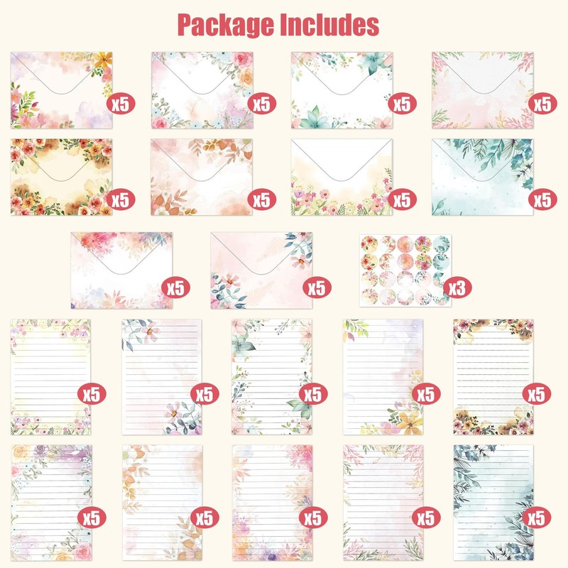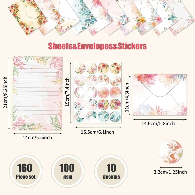 - Package Includes: You will receive 10 sets writing stationery paper in different styles , Each set 5 sheets letter paper and 5 sheets envelopes per set. There are 50 sheets writing paper, 50 envelopes in total and 60 floral sealing stickers.